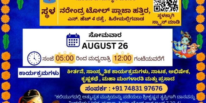 ನರೇಂದ್ರ ಟೋಲ್ ಪ್ಲಾಜಾ ಹತ್ತಿರ, ಎನ್. ಹೆಚ್ 4 ರಸ್ತೆ, ಹಿರೇಮಲ್ಲಿಗವಾಡದಲ್ಲಿರುವ ನೂತನ ಇಸ್ಕಾನ್ ದೇವಸ್ಥಾನ ಪರಿಸರದಲ್ಲಿ ಹಮ್ಮಿಕೊಳ್ಳಲಾಗಿದೆ. ಕೀರ್ತನೆ, ಸಾಂಸ್ಕೃತಿಕ ಕಾರ್ಯಕ್ರಮಗಳು, ನಾಟಕ, ಅಭಿಷೇಕ, ಕೃಷ್ಣಕಥೆ, ಮಹಾ ಮಂಗಳಾರತಿ ಮತ್ತು ಪ್ರಸಾದ ನಡೆಯಲಿವೆ. ಕಲಿಯುಗದಲ್ಲಿ ಅತ್ಯುನ್ನತ ಮುಕ್ತಿಯನ್ನು ಪಡೆಯಲು ಶ್ರೀಕೃಷ್ಣನ ತೃಪ್ತಿಗಾಗಿ ದಾನವನ್ನು ನೀಡಬೇಕು” ಪದ್ಮ ಪುರಾಣ ನಡೆಯಲಿದೆ ಎಂದು ಪ್ರಕಟಣೆ ತಿಳಿಸಿದೆ.
