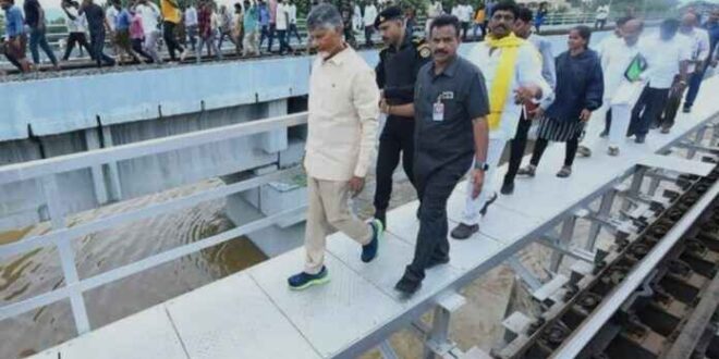 ಉನ್ನತ ಅಧಿಕಾರಿಗಳೊಂದಿಗೆ ಪ್ರವಾಹ ಪೀಡಿತ ಮಧುರಾನಗರದ ಬುಡಮೇರುಗೆ ಭೇಟಿ ನೀಡಿದ್ದರು. ಚಂದ್ರಬಾಬು ನಾಯ್ಡು ಅವರು ರೈಲ್ವೆ ಸೇತುವೆಯ ಮೇಲೆ ನಿಂತು ಪ್ರವಾಹ ಪರಿಸ್ಥಿತಿಯ ಅವಲೋಕನ ನಡೆಸುತ್ತಿದ್ದರು, ಮುಖ್ಯಮಂತ್ರಿಗಳು ರೈಲ್ವೇ ಸೇತುವೆಯ ಮೇಲೆ ನಡೆದು ಪ್ರವಾಹ ಪೀಡಿತ ಪ್ರದೇಶಗಳ ಅವಲೋಕನ ಮಾಡುತ್ತಿದ್ದಾಗ, ಹೈಸ್ಪೀಡ್ ರೈಲು ಅವರ ಮೂಲಕ ಹಾದುಹೋದಾಗ, ಅದೃಷ್ಟವಶಾತ್ ಅವರಿಗೆ ಏನೂ ಆಗಲಿಲ್ಲ ಎಂದು ತಿಳಿಸಿದ್ದಾರೆ.