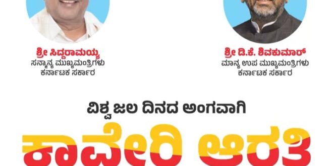ವಿಶ್ವ ಜಲ ದಿನದ ಅಂಗವಾಗಿ “ಜಲವೇ ಜೀವನ” ಅಭಿಯಾನದ ಅಡಿಯಲ್ಲಿ ಮುಖ್ಯಮಂತ್ರಿಗಳಾದ ಶ್ರೀ ಸಿದ್ದರಾಮಯ್ಯನವರು ಹಾಗೂ ಉಪಮುಖ್ಯಮಂತ್ರಿಗಳಾದ ಡಿಕೆ ಶಿವಕುಮಾರ್ ಅವರ ನೇತೃತ್ವದಲ್ಲಿ ಮಾರ್ಚ್ 21 ಶುಕ್ರವಾರ ಸಂಜೆ 6:00ಗೆ ಸ್ಯಾಂಕಿ ಕೆರೆಯಲ್ಲಿ ಪವಿತ್ರ ಕಾವೇರಿ ಆರತಿ ಕಾರ್ಯಕ್ರಮ ಜರುಗಲಿದೆ. ಈ ಜಲವೇ ಜೀವನ ಅಭಿಯಾನದ ಅಡಿಯಲ್ಲಿ ಸಾರ್ವಜನಿಕರಿಂದ ಅತಿ ಹೆಚ್ಚು ಸಂಖ್ಯೆಯಲ್ಲಿ ಜಲ ಸಂರಕ್ಷಣೆಯ ಪ್ರತಿಜ್ಞೆ ಮಾಡಿಸುವ ಮೂಲಕ BWSSB ಗಿನ್ನಿಸ್ ವಿಶ್ವ ದಾಖಲೆ ರೂಪಿಸಲು ಸಜ್ಜಾಗಿದೆ. ಅತಿ ಹೆಚ್ಚು ಸಾರ್ವಜನಿಕರು ಕಾರ್ಯಕ್ರಮದಲ್ಲಿ ಪಾಲ್ಗೊಂಡು ಜಲ ಸಂರಕ್ಷಣೆಯ ಪ್ರತಿಜ್ಞೆ ಮಾಡಿ ಕಾರ್ಯಕ್ರಮವನ್ನು ಯಶಸ್ವಿಗೊಳಿಸಬೇಕಾಗಿದೆ.
