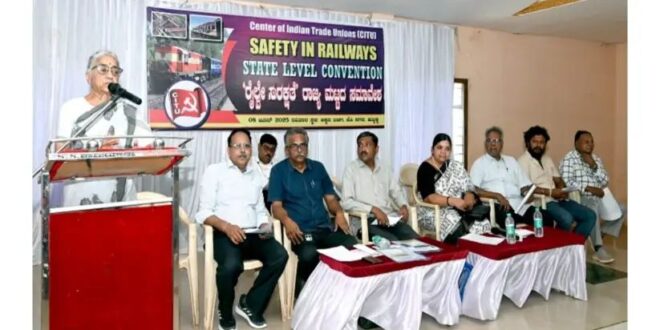 ಸೆಂಟರ್ ಆಫ್ ಇಂಡಿಯನ್ ಟ್ರೇಡ್ ಯೂನಿಯನ್ಸ್ (ಸಿಐಟಿಯು) ವತಿಯಿಂದ ಇಲ್ಲಿಯ ಜೆ.ಸಿ. ನಗರದ ಅಕ್ಕನ ಬಳಗದ ಸಭಾಂಗಣದಲ್ಲಿ ಏರ್ಪಡಿಸಿದ್ದ ರೈಲ್ವೆ ಸುರಕ್ಷತೆ ರಾಜ್ಯ ಮಟ್ಟದ ಸಾರ್ವಜನಿಕ ಸಮಾವೇಶದಲ್ಲಿ ಅವರು ಮಾತನಾಡಿದರು. ಭಾರತದ ರೈಲ್ವೆ ಇಲಾಖೆಯನ್ನು ಖಾಸಗೀಕರಣ ಮಾಡಲಾಗಿದೆ.ಪ್ರಯಾಣಿಕರು ಹಾಗೂ ನೌಕರರಲ್ಲಿಯೂ ಅಸುರಕ್ಷತೆ ಭಾವ ಮನೆ ಮಾಡಿದೆ ಎಂದು ಸಿಐಟಿಯು ಅಖಿಲ ಭಾರತ ಅಧ್ಯಕ್ಷೆ ಡಾ.ಕೆ. ಹೇಮಲತಾ ಅಭಿಪ್ರಾಯಪಟ್ಟರು. ಪ್ರತಿ ವರ್ಷವೂ ರೈಲ್ವೆ ಅಪಘಾತ ಸಂಖ್ಯೆಯಲ್ಲಿ ಹೆಚ್ಚಳವಾಗಿದೆ. ಇದೇ ವಿಷಯ ಇಟ್ಟುಕೊಂಡು ಜನರಲ್ಲಿ ಜಾಗೃತಿ, ಸಾರ್ವಜನಿಕ ಅಭಿಪ್ರಾಯ ಸಂಗ್ರಹ, ಸಿಬ್ಬಂದಿಗೆ ಸುರಕ್ಷತೆ ಒದಗಿಸಲು ಸಮಾವೇಶ ನಡೆಸಲಾಗುತ್ತಿದೆ ಎಂದರು.ಸಿಐಟಿಯು ಕರ್ನಾಟಕ ಉಪಾಧ್ಯಕ್ಷ ವಿಜೆಕೆ ನಾಯರ್, ಕೆ. ಮಹಾಂತೇಶ, ಎಐಎಲ್ಆರ್ಎಸ್ಎ ಪ್ರಧಾನ ಕಾರ್ಯದರ್ಶಿ ಕೆ.ಸಿ. ಜೇಮ್ಸ್, ಎಐಜಿಸಿ ಕಾರ್ಯದರ್ಶಿ ಎ.ಕೆ. ದುಭೆ, ಎ.ವಿ. ಕಾಂತರಾಜು, ಬಿ.ಐ. ಈಳಿಗೇರ, ಮಹೇಶ ಪತ್ತಾರ, ಗುರುಸಿದ್ದಪ್ಪ ಅಂಬಿಗೇರ, ಕಸಾಪ ಜಿಲ್ಲಾಧ್ಯಕ್ಷ ಡಾ. ಲಿಂಗರಾಜ ಅಂಗಡಿ ಇತರರು ಇದ್ದರು