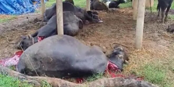 ಆಂಧ್ರಪ್ರದೇಶದ ಎಲೂರು ಜಿಲ್ಲೆ ಲಿಂಗಪಾಲಂ ಮಂಡಲದ ಮಾಥ ಗುಡೆಮ್ ಉಪನಗರದ ಸುಂದರರಾವ್ಪೇಟ್ ಗ್ರಾಮದಲ್ಲಿ ತೋರ್ಲಪತಿ ರವಿ ಎಂಬುವವರಿಗೆ ಸೇರಿದ ಮೂರು ಎಮ್ಮೆಗಳನ್ನು ಕ್ರೂರವಾಗಿ ಶಿರಚ್ಛೇದ ಮಾಡಲಾಗಿದೆ. ಈ ವಿಷಯವನ್ನು ಧರ್ಮಜಿಗುಡೆಮ್ ಪೊಲೀಸರಿಗೆ ವರದಿ ಮಾಡಲಾಗಿದೆ. ಪೊಲೀಸರು ಸ್ಥಳಕ್ಕೆ ತಲುಪಿ ಪರಿಶೀಲನೆ ನಡೆಸಿ ಪ್ರಕರಣ ದಾಖಲಿಸಿದ್ದಾರೆ. ಇಂತಹ ಘಟನೆಗಳು ಮತ್ತೆ ಸಂಭವಿಸದಂತೆ ಆರೋಪಿಗಳನ್ನು ಶೀಘ್ರವೇ ಹಿಡಿದು ಶಿಕ್ಷೆ ವಿಧಿಸಬೇಕೆಂದು ಸುತ್ತಮುತ್ತಲಿನ ಹಳ್ಳಿಗಳ ಜನರು ಒತ್ತಾಯಿಸುತ್ತಿದ್ದಾರೆ.