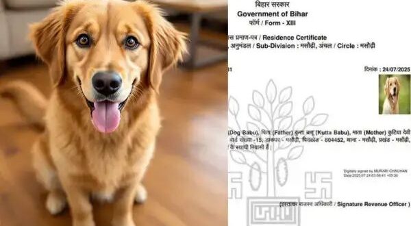 ಬಿಹಾರದಲ್ಲಿ ಮತಪಟ್ಟಿ ಪರಿಷ್ಕರಣೆ ನಡೆಯುತ್ತಿರುವ ವಿವಾದದ ಮಧ್ಯೆ ಪಟ್ನಾ ಜಿಲ್ಲೆಯಲ್ಲಿ ಶ್ವಾನ(ನಾಯಿ) ಹೆಸರಿಲ್ಲಿ ವಾಸಸ್ಥಳ ಪ್ರಮಾಣ ಪತ್ರ ನೀಡಿದ ವಿಚಿತ್ರ ಘಟನೆ ಬೆಳಕಿಗೆ ಬಂದಿದೆ.ಮಸೌರ್ಹಿಯಲ್ಲಿರುವ ಸರ್ಕಾರದ ಸಾರ್ವಜನಿಕ ಸೇವೆಗಳ ಹಕ್ಕು(RTPS) ಪೊರ್ಟಲ್ ಮೂಲಕ ಈ ಪ್ರಮಾಣ ಪತ್ರ ನೀಡಲಾಗಿದೆ ಎಂದು ವರದಿಯಾಗಿದೆ.
