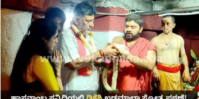 ಸಿಎಂ ರೇಸ್ನಲ್ಲಿರುವ ಡಿಕೆ ಶಿವಕುಮಾರ್ ಪತ್ನಿ ಉಷಾ ಅವರ ಜೊತೆ ಹಾಸನಾಂಬೆ ದೇವಿಯ ಗರ್ಭಗುಡಿಯಲ್ಲಿ ಸುಮಾರು 15 ನಿಮಿಷ ಆಸೀನರಾಗಿ ವಿಶೇಷ ಪೂಜೆಸಲ್ಲಿಸಿದರು. ಶಕ್ತಿಯುತವಾದ ನಾರಾಯಣಿ ನಮಸ್ಕಾರ ಮಂತ್ರ ಮತ್ತು ಖಡ್ಗಮಾಲಾ ಸ್ತ್ರೋತ್ರ ಪಠಿಸಿದರು. ನಾರಾಯಣಿ ನಮಸ್ಕಾರ ಮಂತ್ರ ದುರ್ಗಾ ಸಪ್ತಸತಿಯ 11ನೇ ಅಧ್ಯಾಯದಲ್ಲಿ ಬರುವ ಮಂತ್ರವಾಗಿದೆ. ಇದು ಅತ್ಯಂತ ಪ್ರಬಲ ಪೂಜೆಯಾಗಿದ್ದು ತಮ್ಮ ಇಷ್ಟಾರ್ಥ ಸಿದ್ದಿಗಾಗಿ ಚಂಡಿಕಾ ಹೋಮ ಮಾಡುವ ವೇಳೆ ಪಠಿಸುವ ಮಂತ್ರವಾಗಿದೆ. ಸುಮಾರು 5 ನಿಮಿಷಗಳ ಕಾಲ ಡಿಕೆಶಿ ಖಡ್ಗಮಾಲಾ ಸ್ತ್ರೋತ್ರವನ್ನು ಪಠಿಸಿದ್ದಾರೆ.