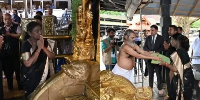 ರಾಷ್ಟ್ರಪತಿ ದ್ರೌಪದಿ ಮುರ್ಮು ಅಧಿಕಾರಕ್ಕೆ ಬಂದ ಬಳಿಕ ಈಗ ಹೊಸ ಇತಿಹಾರ ಬರೆಯುವ ಕೆಲಸ ಮಾಡಿದ್ದಾರೆ. ಕೇರಳದ ಶಬರಿಮಲೆ ದೇವಾಲಯಕ್ಕೆ ಭೇಟಿ ನೀಡುವ ಮೂಲಕ ಈ ದೇವಾಲಯದಲ್ಲಿ ಪೂಜೆ ಸಲ್ಲಿಸಿದ ಮೊದಲ ಮಹಿಳಾ ರಾಷ್ಟ್ರಪತಿ ಎಂಬ ಹೆಗ್ಗಳಿಕೆಗೆ ಪಾತ್ರರಾಗಿದ್ದಾರೆ. ರಾಷ್ಟ್ರಪತಿ ದ್ರೌಪದಿ ಮುರ್ಮು ಬುಧವಾರ ಶಬರಿಮಲೆಯ ಅಯ್ಯಪ್ಪ ಸ್ವಾಮಿ ದೇಗುಲಕ್ಕೆ ಭೇಟಿ ನೀಡಿದ್ದರು.ಇರುಮುಡಿಯಿಂದಿಗೆ ಅವರು ಅಯ್ಯಪ್ಪನ ದರ್ಶನ ಪಡೆದರು. ಹಾಗೆ ಊಟಕ್ಕಾಗಿ ಅಲ್ಲಿನ ಅತಿಥಿ ಗೃಹಕ್ಕೆ ತೆರಳಿದರು. ಹಾಗೆ ಇನ್ನು 4 ದಿನಗಳ ಕಾಲ ಅವರು ಕೇರಳ ಪ್ರವಾಸದಲ್ಲಿ ಕಳೆಯಲಿದ್ದಾರೆ.