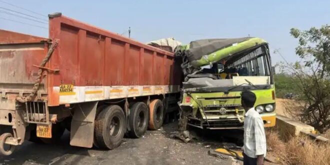 ಬಾಗಲಕೋಟೆ : ಬಸ್ ಮತ್ತು ಲಾರಿ ಮುಖಾಮುಖಿ ಡಿಕ್ಕಿಯಾದ ಪರಿಣಾಮ ಬಸ್ ಚಾಲಕನ ಕಾಲು ತುಂಡಾಗಿರುವ ಜೊತೆಗೆ ಹಲವು ಪ್ರಯಾಣಿಕರು ಗಂಭೀರವಾಗಿ ಗಾಯಗೊಂಡಿರುವ ಘಟನೆ ಲೋಕಾಪುರ ಹೊರವಲಯದಲ್ಲಿ ನಡೆದಿದೆ.ಬೆಳಗಾವಿ-ರಾಯಚೂರು ರಾಜ್ಯ ಹೆದ್ದಾರಿಯಲ್ಲಿ ನಡೆದಿರುವ ಈ ಅಪಘಾತದಲ್ಲಿ ಗಾಯಗೊಂಡವರನ್ನು ಲೋಕಾಪೂರ ಸರ್ಕಾರಿ ಆಸ್ಪತ್ರೆಗೆ ರವಾನೆ ಮಾಡಲಾಗಿದೆ. ಡಿಕ್ಕಿಯ ರಭಸಕ್ಕೆ ಬಸ್ ಮತ್ತು ಲಾರಿಯ ಮುಂಭಾಗ ಸಂಪೂರ್ಣ ನಜ್ಜುಗುಜ್ಜಾಗಿದ್ದು, ಸ್ಥಳಕ್ಕೆ ಲೋಕಾಪುರ ಪೊಲೀಸರು ಭೇಟಿ ನೀಡಿ ಪರಿಶೀಲನೆ ನಡೆಸಿದ್ದಾರೆ.
