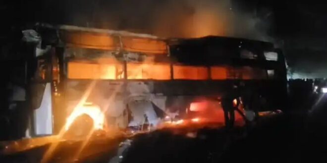 ಶಿವಮೊಗ್ಗ: ಚಿತ್ರದುರ್ಗದ ಬಳಿ ನಡೆದ ಬಸ್ ದುರಂತ ಮಾಸುವ ಮುನ್ನವೇ ಮತ್ತೊಂದು ಅವಘಡ ನಡೆದಿದೆ. ಆಕಸ್ಮಿಕವಾಗಿ ಕಾಣಿಸಿಕೊಂಡಿದ್ದ ಬೆಂಕಿಯಿಂದ ಖಾಸಗಿ ಸ್ಲೀಪರ್ ಬಸ್ಸೊಂದು ಸಂಪೂರ್ಣವಾಗಿ ಅಗ್ನಿಗೆ ಆಹುತಿಯಾಗಿರುವ ಘಟನೆ ಶಿವಮೊಗ್ಗ ಜಿಲ್ಲೆ ಹೊಸನಗರ ತಾಲೂಕಿನ ಸೂಡುರು ಬಳಿ ನಡೆದಿದೆನಿಟ್ಟೂರಿಂದ ಬೆಂಗಳೂರಿಗೆ ಹೊರಟಿದ್ದ ಅನ್ನಪೂರ್ಣೇಶ್ವೇರಿ ಟ್ರಾವಲ್ಸ್ಗೆ ಸೇರಿದ ಖಾಸಗಿ ಬಸ್ನಲ್ಲಿ ಬೆಂಕಿ ಕಾಣಿಸಿಕೊಂಡಿದ್ದು, ಈ ವೇಳೆ ಬಸ್ ನಿಲ್ಲಿಸಲು ಚಾಲಕ ಮುಂದಾದಾಗ ಮರಕ್ಕೆ ಡಿಕ್ಕಿಯಾಗಿದೆ. ಬಸ್ನಲ್ಲಿದ್ದ 36 ಪ್ರಯಾಣಿಕರು ಕೂಡಲೇ ಕೆಳಗಿಳಿದ ಪರಿಣಾಮ ಭಾರೀ ಅನಾಹುತವೊಂದು ತಪ್ಪಿದೆ. ಘಟನೆಯಲ್ಲಿ 4-5 ಪ್ರಯಾಣಿಕರಿಗೆ ಸುಟ್ಟ ಗಾಯಗಳಾಗಿದ್ದು, ಗಾಯಾಳುಗಳನ್ನು ಶಿವಮೊಗ್ಗದ ಮೆಗ್ಗಾನ್ ಆಸ್ಪತ್ರೆಗೆ ಶಿಫ್ಟ್ ಮಾಡಲಾಗಿದೆ.