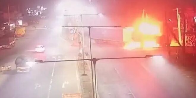 ಆಂಧ್ರಪ್ರದೇಶದ ಕಾಕಿನಾಡದಲ್ಲಿ ಎರಡು ಟ್ರಕ್ಗಳ ನಡುವೆ ಡಿಕ್ಕಿ ಸಂಭವಿಸಿ ಬೆಂಕಿ ಹೊತ್ತಿಕೊಂಡಿದ್ದು, ಚಾಲಕ ಸಜೀವದಹನವಾಗಿದ್ದಾರೆ. ಕತಿಪುಡಿ ಪ್ರದೇಶದಲ್ಲಿ ನಡೆದ ಆಘಾತಕಾರಿ ಘಟನೆಯು ಸಿಸಿಟಿವಿಯಲ್ಲಿ ಸೆರೆಯಾಗಿದೆ.ಹೆಚ್ಚು ವಾಹನಗಳು ಓಡಾಡುವ ಹೆದ್ದಾರಿ, ಪಕ್ಕದ ರಸ್ತೆಯಿಂದ ಟ್ರಕ್ ಒಂದು ಯೂಟರ್ನ್ ತೆಗೆದುಕೊಳ್ಳುವಾಗ ಈ ಅಪಘಾತ ಸಂಭವಿಸಿದೆ. ಎರಡೂ ವಾಹನಗಳು ಡಿಕ್ಕಿ ಹೊಡೆದ ತಕ್ಷಣ ಬೆಂಕಿ ಹೊತ್ತಿಕೊಂಡಿತ್ತು. ಬೆಂಕಿ ಹರಡುವ ಮೊದಲೇ ಓರ್ವ ಚಾಲಕ ಸುರಕ್ಷಿತವಾಗಿ ಹೊರಬರುವಲ್ಲಿ ಯಶಸ್ವಿಯಾದರು. ಆದರೆ ಮತ್ತೊಂದು ಟ್ರಕ್ನಲ್ಲಿದ್ದ ಚಾಲಕನಿಗೆ ಅದು ಸಾಧ್ಯವಾಗಲಿಲ್ಲ.