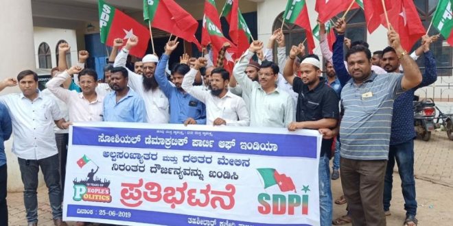 ಹುಬ್ಬಳ್ಳಿ, ಅಲ್ಪಸಂಖ್ಯಾತರ ಮತ್ತು ದಲಿತರ ಮೇಲಿನ ನಿರಂತರ ದೌರ್ಜನ್ಯವನ್ನು ಖಂಡಿಸಿ ಸೋಶಿಯಲ್ ಡೆಮಾಕ್ರಟಿಕ್ ಪಾರ್ಟಿ ಆಫಗ ಇಂಡಿಯಾ ನಗರದ ತಹಶಿಲ್ದಾರರ ಕಚೇರಿ ಎದುರು ಪ್ರತಿಭಟನೆ ಮಾಡಿ ತಹಶಿಲ್ದಾರರ ಮೂಲಕ ರಾಜ್ಯ ಸರ್ಕಾರಕ್ಕೆ ಮನವಿ ಸಲ್ಲಿಸಿದರು.ಈ ವೇಳೆ ರಾಜ್ಯದಲ್ಲಿ ನಿರಂತರವಾಗಿ ಅಲ್ಪಸಂಖ್ಯಾತರು, ದಲಿತರ ಮೇಲೆ ಹಲ್ಲೇಗಳಾಗುತ್ತಿದ್ದನ್ನು ಖಂಡಿಸಿ ಘೋಷಣೆ ಕೂಗಿದ ಅವರು, ನಿರಂತರ ದೌರ್ಜನ್ಯಗಳನ್ನು ನೋಡಿದರೆ ದಲಿತರಿಗೆ, ಅಲ್ಪಸಂಖ್ಯಾತರಿಗೆ ಯಾವುದೇ ರಕ್ಷಣೆ ಇಲ್ಲದಂತಾಗಿದೆ. ಕೂಡಲೇ ರಾಜ್ಯದ ನಾನಾ ಕಡೆಗಳಲ್ಲಿ ಸಂಬಂಧಿಸಿದ ಅಲ್ಪಸಂಖ್ಯಾತರ ಮತ್ತು ದಲಿತರ ಮೇಲೆ ಹಲ್ಲೆ ಮಾಡಿದವರ ವಿರುದ್ಧ ಕಾನೂನು ಕ್ರಮ ಜರುಗಿಸಿ ಹಲ್ಲೇಗೆ ಒಳಗಾದವರಿಗೆ ನ್ಯಾಯ ಒದಗಿಸಬೇಕು. ರಾಜ್ಯದಲ್ಲಿ ಶಾಂತಿ – ಸೌಹಾರ್ದತೆ ಕಾಪಾಡಲು ಜಾತಿ – ಧರ್ಮ ಮತ್ತು ಭಾಷೆಯ ಹೆಸರಿನಲ್ಲಿ ಅಪನಂಬಿಕೆ ಹೋಗಲಾಡಿಸಲು ಸರ್ಕಾರ ವಿಶೇಷ ಕಾರ್ಯಕ್ರಮ ಹಮ್ಮಿಕೊಳ್ಳಬೇಕೆಂದು ಆಗ್ರಹಿಸಿದರು.ಈ ಸಂದರ್ಭದಲ್ಲಿ ಸೋಶಿಯಲ್ ಡೆಮಾಕ್ರಟಿಕ್ ಪಾರ್ಟಿ ಆಫ್ ಇಂಡಿಯಾದ ಅಧ್ಯಕ್ಷ ಮೊಹಮ್ಮದ್ ರಫೀಕ್ ಲಷ್ಕರ್,ಉಪಾಧ್ಯಕ್ಷ ಸಮೀರ ಬೇಟಗೇರಿ, ಇರ್ಷಾದ್ ಅಹ್ಮದ ರಿತ್ತಿ, ಅಬ್ದುಲ್ಲಾ ಕುಂಬಳೂರ, ಹಮೀದ ಬೆಂಗಾಲಿ, ರಫೀಕ್ ಬಿಸ್ತಿ ಸೇರಿದಂತೆ ನೂರಾರು ಕಾರ್ಯಕರ್ತರು ಇದ್ದರು..