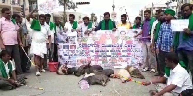 ಕೋಲಾರ: ರಾಜ್ಯ ರಾಜಕೀಯದಲ್ಲಿ ಸಿಎಂ ಪದವಿಗಾಗಿ ನಡೆಯುತ್ತಿರುವ ಹೈಡ್ರಾಮ ಖಂಡಿಸಿ ರಾಜ್ಯ ರೈತ ಸಂಘ ಹಾಗೂ ಹಸಿರು ಸೇನೆ ಕಾರ್ಯಕರ್ತರು ಹಂದಿ ನಾಯಿಗಳನ್ನು ಕರೆತಂದು ಪ್ರತಿಭಟನೆ ನಡೆಸಿದರು.
