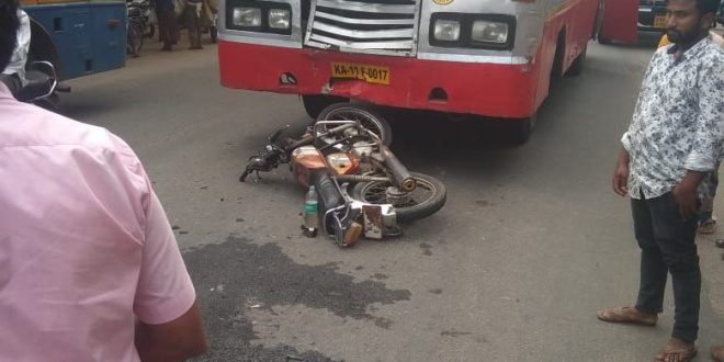 ಮಂಡ್ಯ: ಕೆ.ಎಸ್.ಆರ್.ಟಿ.ಸಿ ಬಸ್ಸು ಮತ್ತು ಬೈಕ್ ನಡುವೆ ಮುಖಾಮುಖಿ ಢಿಕ್ಕಿ ಬೈಕ್ ಸವಾರ ವಸಂತಕುಮಾರ್ ತಲೆಗೆ ತೀವ್ರ ಪೆಟ್ಟಾಗಿರುವ ಘಟನೆಮಂಡ್ಯ ಜಿಲ್ಲೆಯ ಲೋಕೋಪಯೋಗಿ ಕಛೇರಿಯ ಮುಂಭಾಗ ಮೈಸೂರು ಚನ್ನರಾಯಪಟ್ಟಣ ಮುಖ್ಯ ರಸ್ತೆಯಲ್ಲಿ ನಡೆದಿದೆ.ಮಂಡ್ಯ ಜಿಲ್ಲೆ ಕೆ.ಆರ್.ಪೇಟೆ ತಾಲ್ಲೂಕಿನ ಚಿಕ್ಕೋನಹಳ್ಳಿ ಗ್ರಾಮದ ಕೊಂಡೇಗೌಡರ ಪುತ್ರ ವಸಂತಕುಮಾರ್(48) ತಮ್ಮ ಹೀರೋಹೋಂಡಾ ಬೈಕಿನಲ್ಲಿ ಕೆ.ಆರ್.ಪೇಟೆಯಿಂದ ಹೋಗುತ್ತಿದ್ದ ರೈತ ವಸಂತಕುಮಾರ್ ಅವರಿಗೆ ರಾಜ್ಯ ರಸ್ತೆ ಸಾರಿಗೆ ಸಂಸ್ಥೆಯ ಬಸ್ಸು ಢಿಕ್ಕಿ ಹೊಡೆದ ಕಾರಣ ತಲೆಗೆ ಗಂಭೀರ ಸ್ವರೂಪದ ಗಾಯವಾಗಿದ್ದು, ಭಾರೀ ರಕ್ತಸ್ರಾವ ವಾಗಿದ್ದು ಸಾವು ಬದುಕಿನ ನಡುವೆ ಹೋರಾಟ ನಡೆಸುತ್ತಿದ್ದಾರೆ. ಗಂಭೀರವಾಗಿ ಗಾಯಗೊಂಡಿರುವ ವಸಂತಕುಮಾರ್ ಅವರನ್ನು ಹೆಚ್ಚಿನ ಚಿಕಿತ್ಸೆಗಾಗಿ ಮೈಸೂರಿನ ಕೆ.ಆರ್.ಆಸ್ಪತ್ರೆಗೆ ಕಳುಹಿಸಲಾಗಿದೆ.ಗಾಯಾಳು ವಸಂತಕುಮಾರ್ ಅವರ ಬಂಧುಗಳು ಪಟ್ಟಣದ ದುಂಡಶೆಟ್ಟಿಲಕ್ಷ್ಮಮ್ಮ ಸ್ಮಾರಕ ಸಾರ್ವಜನಿಕ ಆಸ್ಪತ್ರೆಯ ಬಳಿ ಜಮಾಯಿಸಿದ್ದರು. ಪುರಸಭೆ ಸದಸ್ಯ ಕೆ.ಆರ್.ರವೀಂದ್ರಬಾಬು ತೀವ್ರ ರಕ್ತಸ್ರಾವದಿಂದ ಬಳಲುತ್ತಿದ್ದ ಗಾಯಾಳು ವಸಂತಕುಮಾರ್ ಅವರನ್ನು ಆಸ್ಪತ್ರೆಗೆ ಸಾಗಿಸಿ ಸೂಕ್ತ ಪ್ರಾಥಮಿಕ ಚಿಕಿತ್ಸೆ ಕೊಡಿಸಿ ಹೆಚ್ಚಿನ ಚಿಕಿತ್ಸೆಗಾಗಿ ಮೈಸೂರಿಗೆ ಸಾಗಿಸುವಲ್ಲಿ ನೆರವಾದರು. ಪಟ್ಟಣ ಪೋಲಿಸ್ ಠಾಣೆಯಲ್ಲಿ ಪ್ರಕರಣ ದಾಖಲಾಗಿದೆ. ರಾಜ್ಯ ರಸ್ತೆ ಸಾರಿಗೆ ಸಂಸ್ಥೆಯ ಬಸ್ಸಿನ ಚಾಲಕನನ್ನು ಪೋಲಿಸರು ವಶಕ್ಕೆ ಪಡೆದಿದ್ದು ಮುಂದಿನ ತನಿಖೆ ಕೈಗೊಂಡಿದ್ದಾರೆ.