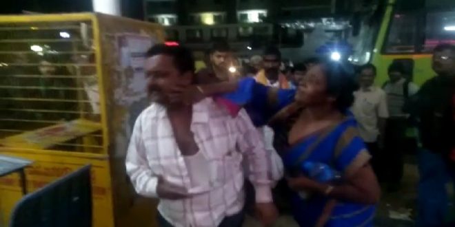 ಬಸ್ ನಿಲ್ದಾಣದಲ್ಲಿನ ಸಿಕ್ಕ ಸಿಕ್ಕವರನ್ನು ಥಳಿಸಿ, ಅವಾಚ್ಯವಾಗಿ ನಿಂದಿಸಿದ್ದಾಳೆ.