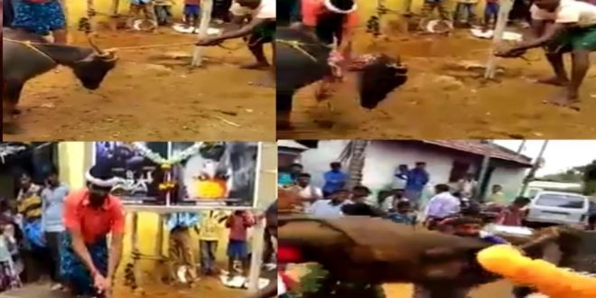 ನಿನ್ನೆ ಅಂಧಾಭಿಮಾನದಿಂದ ಕೆಲವರು ಕುರಿ ಬಲಿಕೊಟ್ಟು ದಿ ವಿಲನ್’ ಪೋಸ್ಟರ್ಗೆ ರಕ್ತಾಭಿಷೇಕ ಮಾಡಿದ್ದರು. ಶಿಕಾರಿಪುರದ ಮಾಲತೇಶ ಚಿತ್ರಮಂದಿರದ ಎದುರು ಫ್ಯಾನ್ಸ್ ಇಂತಹ ವಿಲಕ್ಷಣ ಕೃತ್ಯ ಎಸಗಿದ್ದರು. ಈ ಘಟನೆ ಮರೆಯುವ ಮೊದಲೇ ಮತ್ತೊಂದು ಘಟನೆ ವರದಿಯಾಗಿದೆ. ದಾವಣಗೆರೆ ಜಿಲ್ಲೆಯ ಜಗಳೂರಿನಲ್ಲಿ ಕೋಣದ ಮರಿ ಕಡಿದು ಅಂದಾಭಿಮಾನ ಮೆರೆದಿದ್ದಾರೆ.ನಿರ್ದೇಶಕರ ಮನವಿಗೂ ಕರಗದ ಜನ..!ದಿ ವಿಲನ್’ ಸಿನಿಮಾಗಾಗಿ ಪ್ರಾಣಿ ಬಲಿ ನೀಡ್ತಿರೋದನ್ನು ನಿರ್ದೇಶಕ ಜೋಗಿ ಪ್ರೇಮ್ ಖಂಡಿಸಿದ್ದರು. ಇಂತಹ ಅಂದಾಭಿಮಾನ ಬೇಡ ಅಂತಾ ಮನವಿ ಮಾಡಿದ್ದರು. ಆದರೆ ಕೆಲವರು ಮತ್ತೆ ಇಂತಹ ಕೃತ್ಯ ಎಸಗುತ್ತಿದ್ದಾರೆ. ಜಗಳೂರಿನಲ್ಲಿ ನೂರಾರು ಜನರ ಎದುರು ಕೋಣದ ಮರಿ ಕಡಿಯಲಾಗಿದೆ. ಕೋಣವನ್ನು ಎತ್ತಿ ಬಿಸಾಡಿ ಚಿತ್ರ ಹಿಂಸೆ ನೀಡಿದ್ದಾರೆ. ಅಲ್ಲದೇ ಉದ್ದದ ಮಚ್ಚಿನಿಂದ ಕಡಿಯುವುದನ್ನು ಚಿತ್ರೀಕರಿಸಿ ಅಮಾನವೀಯತೆ ತೋರಿದ್ದಾರೆ.