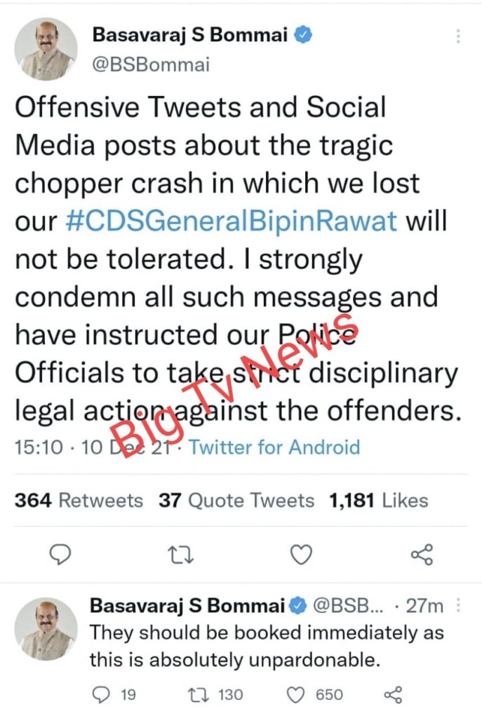ಹಾವೇರಿ :ಸೇನಾಪಡೆಗಳ ಮುಖ್ಯಸ್ಥ ಬಿಪಿನ್ ರಾವತ್ ಅವರು ವೀರ ಮರಣವನ್ನು ಹೊಂದಿದ್ದಾರೆ. ವಿಕೃತ ಮನಸ್ಸಿನ ಕೆಲವು ವ್ಯಕ್ತಿಗಳು ಅವರ ಸಾವಿನ ಬಗ್ಗೆ ಅವಹೇಳನಕಾರಿ, ಸಂಭ್ರಮಾಚರಣೆಯ ಸಂದೇಶಗಳನ್ನು ಟ್ವೀಟ್ ಮಾಡಿದ್ದಾರೆ. ಈ ಅಂಶಗಳ ವಿರುದ್ಧ ಕಾನೂನು ಕ್ರಮ ಕೈಗೊಳ್ಳುವಂತೆ ಪೊಲೀಸರಿಗೆ ಸೂಚನೆ ನೀಡದರು.