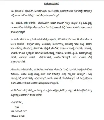 ಕರ್ನಾಟಕದಿಂದ ಪ್ರತಿಷ್ಠಿತ ನೋಬಲ್ ಬುಕ್ನ ವಿಶ್ವ ದಾಖಲೆಯಲ್ಲಿ Most Prolific Peot ಎಂದು ದಾಖಲಿಸಿಕೊಂಡ ಅಮನ, ಏಪ್ರಿಲ್ 4,2020 ರಿಂದ 29 ನವೆಂಬರ್ 2021ರವರೆಗೆ ಒಟ್ಟು 337 ಕವನಗಳನ್ನ ಬರೆದಿದ್ದು, ಇಂಗ್ಲಿಷ್ ಮತ್ತು ಹಿಂದಿಯಲ್ಲಿವೆ. ಇನ್ನೀವು 10070 ಸಾಲುಗಳನ್ನ ಹೊಂದಿವೆ.