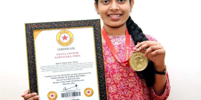 ಬೆಂಗಳೂರು : ನಗರದ ಬಿಷಪ್ ಕಾಟನ್ ಗರ್ಲ್ಸ್ ಸ್ಕೂಲ್ನಲ್ಲಿ ಓದುತ್ತಿರುವ ಕನ್ನಡದ ಕುವರಿ ಅಮನ ಜೆ.ಕುಮಾರ್ ಅವ್ರು 337 ಕವನಗಳನ್ನ ಬರೆಯುವ ಮೂಲಕ ವಿಶ್ವ ದಾಖಲೆ ನಿರ್ಮಿಸಿದ್ದು, ಭಾರತದ ಅತ್ಯಂತ ಕಿರಿಯ ಕವಯಿತ್ರಿ ಅನ್ನೋ ಹೆಗ್ಗಳಿಗೆ ಪಾತ್ರರಾಗಿದ್ದಾರೆ.