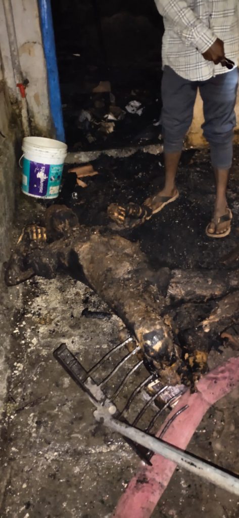 ವಿನಾಯಕ ಚಿನಿವಾಲರ (36) ಎಂಬ ವ್ಯಕ್ತಿಯೇ ಸಜೀವ ದಹನಗೊಂಡವನು. ವಿದ್ಯುತ್ ಸಂಪರ್ಕ ಕಡಿತಗೊಂಡಿದ್ದರಿಂದ ವಿನಾಯಕ ದೀಪ ಹಚ್ಚಲು ಹೋಗಿ ಯಡವಟ್ಟು ಸಂಭವಿಸಿರಬಹುದು ಎಂದು ಪೊಲೀಸರು ಶಂಕೆ ವ್ಯಕ್ತಪಡಿಸಿದ್ದಾರೆ. ಅಲ್ಲದೇ ವಿನಾಯಕ ವಿಪರೀತ ಮದ್ಯವೆಸನಿಯಾಗಿದ್ದ ತಾನೇ ಬೆಂಕಿ ಹಚ್ಚಿಕೊಂಡಿದ್ದಾನೋ ಅಥವಾ ಆಕಸ್ಮಿಕವಾಗಿ ಬೆಂಕಿ ತಗುಲಿದೆಯೋ ಎಂಬುದರ ಬಗ್ಗೆ ತನಿಖೆಯಿಂದ ಗೊತ್ತಾಗಬೇಕಿದೆ.