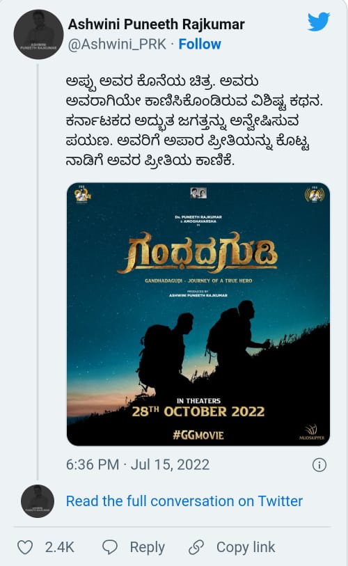 2021 ಅಕ್ಟೋಬರ್ 29 ರಂದು ಪುನೀತ್ ವಿಧಿವಶರಾಗಿದ್ದರು. ಪುನೀತ್ ರಾಜಕುಮಾರ್ ಅವರ ಕೊನೆಯ ಪ್ರೀತಿಯ ಕಾಣಿಕೆ ಗಂಧದ ಗುಡಿ ಸಾಕ್ಷ್ಯಚಿತ್ರ ಬಿಡುಗಡೆಯ ಬಗ್ಗೆ ಅಶ್ವಿನಿ ಪುನೀತ್ ರಾಜಕುಮಾರ್ ಮಾಹಿತಿ ನೀಡಿದ್ದಾರೆ. ವಿಶೇಷ ಪತ್ರವೊಂದನ್ನು ಕೂಡ ಬರೆದಿದ್ದಾರೆ. ಸಾಕ್ಷ್ಯಚಿತ್ರದ ಬಗ್ಗೆ ಪುನೀತ್ ಅವರಿಗಿದ್ದ ಕನಸಿನ ಬಗ್ಗೆ ವಿಶೇಷ ಪತ್ರವನ್ನು ಬರೆದಿದ್ದಾರೆ. ಚಿತ್ರೀಕರಣಕ್ಕೆ ತೆರಳಿದ್ದಾಗ ಆದ ಅನುಭವಗಳ ಬಗ್ಗೆ ಹೇಳಿಕೊಳ್ಳುತ್ತಿದ್ದರು. ಕಾಡಿನ ಅದ್ಭುತಗಳ ಬಗ್ಗೆ ಪತ್ನಿ ಅಶ್ವಿನಿ ಅವರೊಂದಿಗೆ ಪುನೀತ್ ರಾಜಕುಮಾರ್ ಮಾಹಿತಿ ಹಂಚಿಕೊಂಡಿದ್ದರು. ಅವರು ಹೇಳುತ್ತಿದ್ದ ಅಂಶಗಳನ್ನು ಉಲ್ಲೇಖಿಸಿ ಅಶ್ವಿನಿ ಅವರು ಪತ್ರ ಬರೆದಿದ್ದಾರೆ.