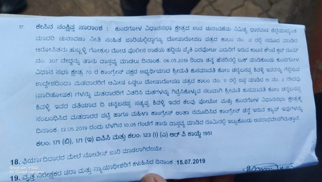 ಕುಂದಗೋಳ ವಿಧಾನಸಭಾ ಉಪಚುನಾವಣೆ ಹಿನ್ನೆಲೆಯಲ್ಲಿ ರಾಜಕೀಯ ಪಕ್ಷಗಳ ಚಟುವಟಿಕೆಗಳ ಮೇಲೆ ಹದ್ದಿನ ಕಣ್ಣು ಇರಿಸಿರುವ ಚುನಾವಣಾ ಆಯೋಗ, ಆದಾಯ ತೆರಿಗೆ ಇಲಾಖೆ ಅಧಿಕಾರಿಗಳ ಮತ್ತು ಎಫ್ ಎಸ್ ಟಿ ಅಧಿಕಾರಿಗಳ ತಂಡ ರಾತ್ರಿ 9.30 ರಿಂದ ಮಧ್ಯರಾತ್ರಿ 2 ಗಂಟೆಯವರೆಗೆ ಹುಬ್ಬಳ್ಳಿ ನಗರದ ವಿವಿಧ ಪ್ರತಿಷ್ಠಿತ ಹೋಟೆಲ್ ಗಳ ಮೇಲೆ ದಾಳಿ ನಡೆಸಿತ್ತು. ರಾತ್ರಿ 10 ಕ್ಕೆ ಗೋಕುಲ ರಸ್ತೆಯ ಖಾಸಗಿ ಹೊಟೇಲ್ ವೊಂದರ ಕೊಠಡಿಯಲ್ಲಿ ಇರಿಸಲಾಗಿದ್ದ, ಮಾಜಿ ಸಚಿವ ದಿ. ಸಿ.ಎಸ್.ಶಿವಳ್ಳಿ ಅವರ 11 ಭಾವಚಿತ್ರಗಳು, ಬಂಗಾರದ ಬಣ್ಣ ಲೇಪಿಸಿರುವ 50 ಅರಿಷಿಣ, ಕುಂಕುಮದ ಬಟ್ಟಲುಗಳು, 7 ಮತದಾರರ ಪಟ್ಟಿಗಳು, ಕೇಸರಿ, ಬಿಳಿ, ಹಸಿರು ವರ್ಣದ ಟೊಪ್ಪಿಗೆ ವಶಪಡಿಸಿಕೊಳ್ಳಲಾಗಿತ್ತು. ಆದರೆ ಇದರಲ್ಲಿ ಶಿವಕುಮಾರ್ ಗೋಕಾವಿ ಎಂಬುವಂತ ಯುವಕನನ್ನು ಸಿಕ್ಕಿ ಹಾಕಿಸಲಾಗಿತ್ತು. ಆದರೆ ನ್ಯಾಯಾಲಯ ತೀವ್ರ ವಿಚಾರಣೆ ಬಳಿಕೆ ಪ್ರಕರಣ ಖುಲಾಸೆ ಮಾಡಿದೆ.