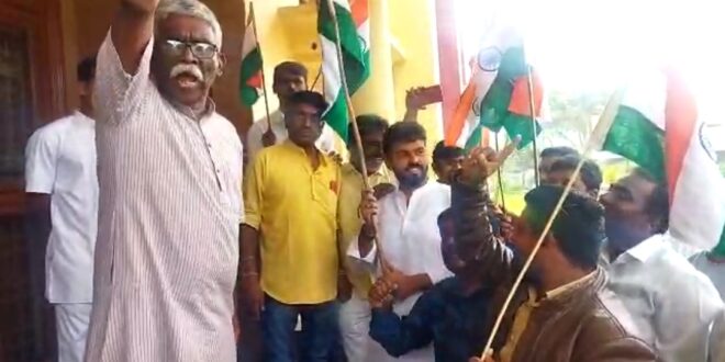 ಆರ್ ಎಸ್ ಎಸ್ ಹಾಗೂ ಕಾಂಗ್ರೆಸ್ ಕಾರ್ಯಕರ್ತರು ಸೇರಿ ಭಾರತ್ ಮಾತಾಕಿ ಜೈ ಎಂದು ಘೋಷಣೆ ಕೂಗಿದರು.ಆರ್ ಎಸ್ ಎಸ್ ಪ್ರಮುಖ ಅಮರನಾಥ ಅವರು ಕಚೇರಿಯಿಂದ ರಾಷ್ಟ್ರಧ್ವಜ ತಂದು ನಮ್ಮ ಬಳಿ ಇದೆ . ಇದನ್ನು ನಾವು ಹಾರಿಸುತ್ತೇವೆ ಎಂದರು ನಂತರ ರಾಷ್ಟ್ರಧ್ವಜ ಸ್ವೀಕರಿಸಿ ಭಾರತ್ ಮಾತಾಕಿ ಜೈ ಎಂದು ಘೋಷಣೆ ಕೂಗಿದರು .