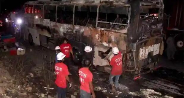 ಕರಾಚಿ:ಪ್ರವಾಹ ಸಂತ್ರಸ್ತರನ್ನು ಕರೆದೊಯ್ಯುತ್ತಿದ್ದ ಹವಾನಿಯಂತ್ರಿತ ಖಾಸಗಿ ಬಸ್ ಗೆ ಏಕಾಏಕಿ ಬೆಂಕಿ ಹೊತ್ತಿಕೊಂಡ ಪರಿಣಾಮ 20 ಮಂದಿ ಸಜೀವ ದಹನವಾಗಿದ್ದು, ಹಲವು ಜನರು ಗಾಯಗೊಂಡಿರುವ ಘಟನೆ ಬುಧವಾರ (ಅಕ್ಟೋಬರ್ 13) ಪಾಕಿಸ್ತಾನದ ನೂರಿಯಾಬಾದ್ ಸಮೀಪದ ಎಂ 9 ಹೆದ್ದಾರಿ ಪ್ರದೇಶದಲ್ಲಿ ಸಂಭವಿಸಿರುವುದಾಗಿ ವರದಿ ತಿಳಿಸಿದೆ.