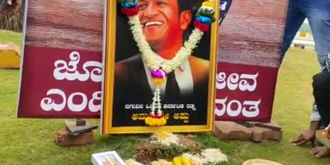 ಹುಬ್ಬಳ್ಳಿ : ನಟ, ದಿವಂಗತ ಪುನೀತ್ ರಾಜ್ಕುಮಾರ್ ಅವರ ಮೊದಲ ವರ್ಷದ ಪುಣ್ಯತಿಥಿ ಅಂಗವಾಗಿ ಹುಬ್ಬಳ್ಳಿಯ ಪುನೀತ್ ಅಭಿಮಾನಿಗಳು ಇಲ್ಲಿನ ಚೆನ್ನಮ್ಮ ವೃತ್ತದಲ್ಲಿ ಪುನೀತ್ ಭಾವಚಿತ್ರಕ್ಕೆ ಹೂವಿನ ಹಾರ ಹಾಕಿ, ಪೂಜೆ ಸಲ್ಲಿಸಿ ಗೌರವ ನಮನ ಸಲ್ಲಿಸಿದರು.