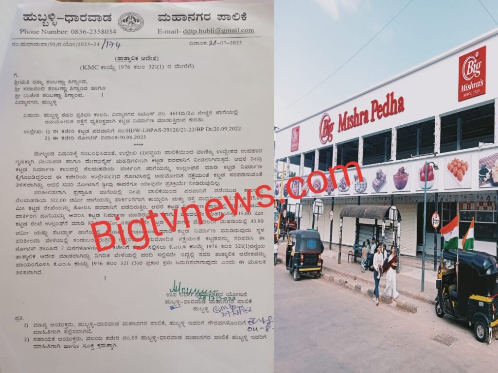 ಹುಬ್ಬಳ್ಳಿ:- ವಿದ್ಯಾನಗರದ ಮುಖ್ಯ ಸರ್ಕಲ್ ನಲ್ಲಿ ತಲೆ ಎತ್ತಿದ ಪೇಡಾ ಅಂಗಡಿ ಈಗ ಎಲ್ಲರ ಕಣ್ಣು ಕುಕ್ಕಿಸುವಂತೆ ಮಾಡಿದೆ.ರಾಜ್ಯದಲ್ಲಿ ಹೆಸರು ಮಾಡಿರುವ ಮಿಶ್ರಾ ಪೇಡಾ!ಈಗ ಅನುಮೋದಿತ ನಕ್ಷೆಗೆ ವಿರೋಧವಾಗಿ ಕಟ್ಟಡ ಕಟ್ಟಿ ಹುಬ್ಬಳ್ಳಿ-ಧಾರವಾಡ ಮಹಾನಗರ ಪಾಲಿಕೆಯಿಂದ ನೋಟೀಸ್ ಹೆಟ್ಟಿಸಿಕೊಂಡಿದೆ.ಅದು ಒಂದಲ್ಲಾ ಎರಡು ನೋಟೀಸ್.ಆದರೆ ಈ ಜಾಗೆಯ ಮಾಲಿಕರು ಮತ್ತು ಪೇಡಾ