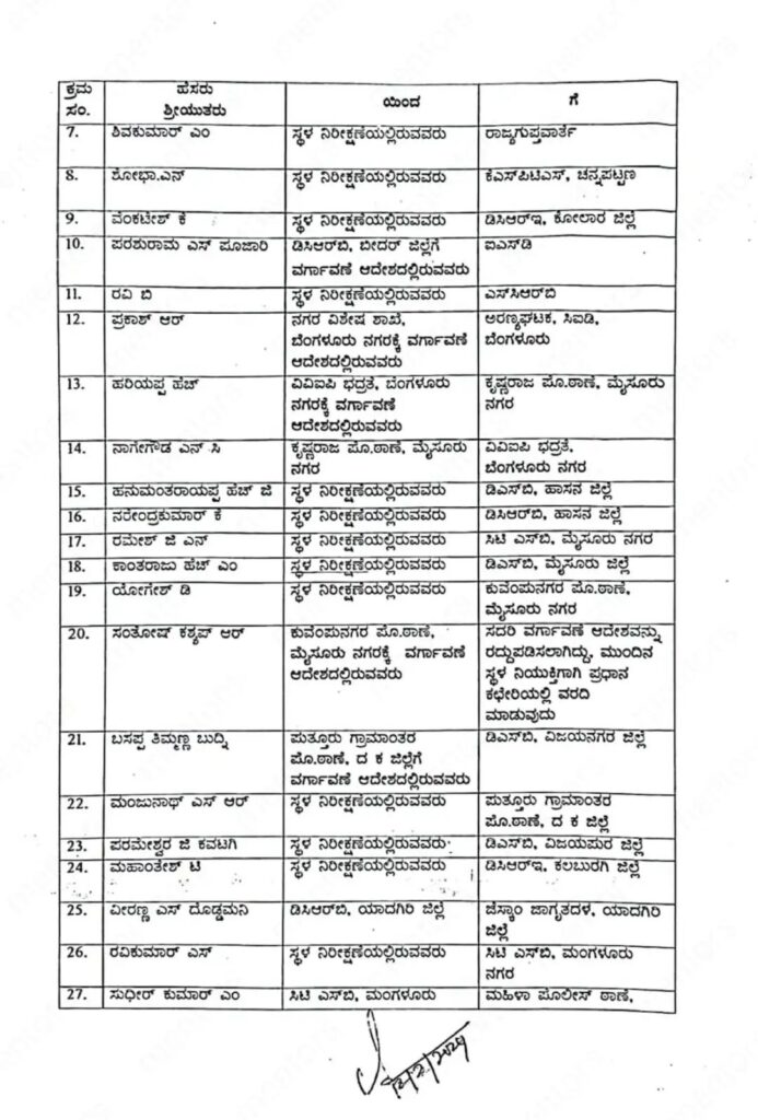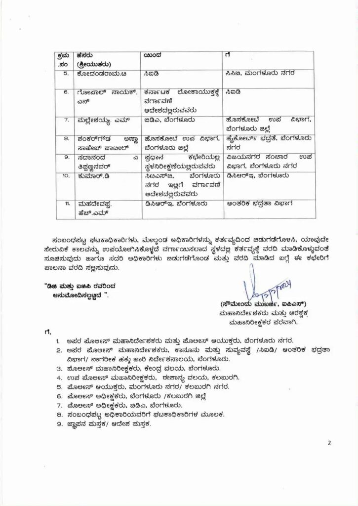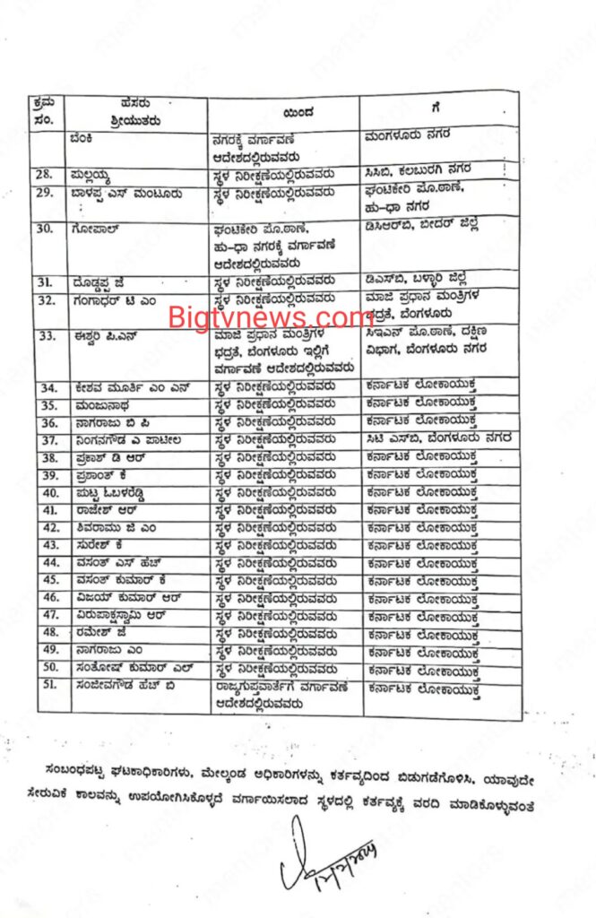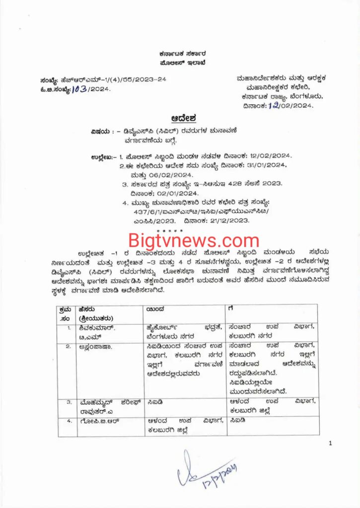 ರಾಜ್ಯ ಸರ್ಕಾರದಿಂದ ಮುಂಬರುವ ಲೋಕಸಭಾ ಚುನಾವಣೆಯ ಹಿನ್ನಲೆಯಲ್ಲಿ, 51 ಪೊಲೀಸ್ ಇನ್ಸ್ ಪೆಕ್ಟರ್ ಹಾಗೂ 11 ಡಿವೈಎಸ್ಪಿ ವರ್ಗಾವಣೆ ಮಾಡಿ ಆದೇಶಿಸಿದೆ. ಈ ಕುರಿತಂತೆ ರಾಜ್ಯ ಸರ್ಕಾರದಿಂದ ವರ್ಗಾವಣೆ ಅಧಿಸೂಚನೆ ಹೊರಡಿಸಿದ್ದು, ಲೋಕಸಭಾ ಚುನಾವಣೆ ನಿಮಿತ್ತ ವರ್ಗಾವಣೆಗೊಳಿಸಲಾಗಿದ್ದ ಆದೇಶವನ್ನು ಭಾಗಶಃ ಮಾರ್ಪಡಿಸಿ, ತಕ್ಷಣದಿಂದ ಜಾರಿಗೆ ಬರುವಂತೆ ಅವರ 11 ಡಿವೈಎಸ್ಪಿಗಳನ್ನು ವರ್ಗಾವಣೆ ಮಾಡಲಾಗಿದೆ ಎಂದಿದೆ. ಟಿಎಂ ಶಿವಕುಮಾರ್ ಅವರನ್ನು ಕಲಬುರ್ಗಿಯ ಸಂಚಾರ ಉಪವಿಭಾಗಕ್ಕೆ, ಅಸ್ಲಂ ಪಾಷಾ ಅವರನ್ನು ಸಂಚಾರ ಉಪ ವಿಭಾಗ, ಕಲಬುರ್ಗಿ ನಗರ ಇಲ್ಲಿಗೆ ಮಾಡಲಾದ ಆದೇಶವನ್ನು ರದ್ದುಪಡಿಸಿ, ಸಿಐಡಿಯಲ್ಲೇ ಮುಂದುವರೆಸಲಾಗಿದೆ.ಮೊಹಮ್ಮದ್ ಶರೀಫ್ ರಾವುತರ್ ಎ ಅವರನ್ನು ಕಲಬುರ್ಗಿಯ ಅಳಂದ ಉಪ ವಿಭಾಗದ ಡಿವೈಎಸ್ಪಿಯಾಗಿ ವರ್ಗಾವಣೆ ಮಾಡಿದ್ದರೇ, ಗೋಪಿ ಬಿಆರ್ ಅವರನ್ನು ಸಿಐಡಿಗೆ ವರ್ಗಾವಣೆ ಮಾಡಿದೆ.ಹೀಗಿದೆ 11 ಡಿವೈಎಸ್ಪಿಗಳ ವರ್ಗಾವಣೆ ಪಟ್ಟಿ