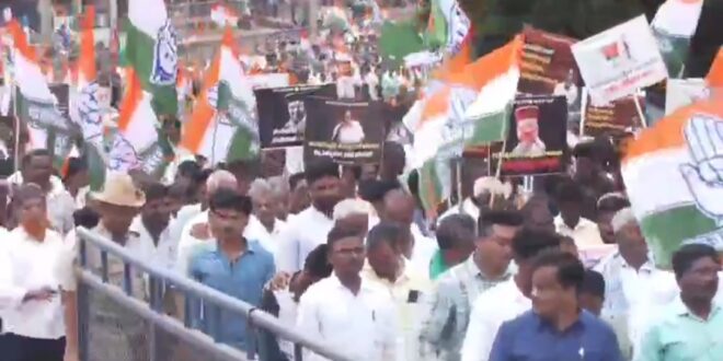 ಧಾರವಾಡ: ಮುಖ್ಯಮಂತ್ರಿ ಸಿದ್ದರಾಮಯ್ಯ ವಿರುದ್ಧ ರಾಜ್ಯಪಾಲರು ಪ್ರಾಸಿಕ್ಯೂಶನ್ ಗೆ ಅನುಮತಿ ನೀಡಿರುವ ಕ್ರಮ ಖಂಡಿಸಿ ಧಾರವಾಡ ನಗರದಾದ್ಯಂತ ಕಾಂಗ್ರೆಸ್ ಕಾರ್ಯಕರ್ತರು ಬೃಹತ್ ಪ್ರತಿಭಟನಾ ಮೆರವಣಿಗೆ ನಡೆಸಿದರು. ಸಚಿವ ಸಂತೋಷ ಲಾಡ್ ನೇತೃತ್ವದಲ್ಲಿ ಬೃಹತ್ ಪ್ರತಿಭಟನಾ ರ್ಯಾಲಿಯನ್ನು ಧಾರವಾಡ ಕಡಪಾ ಮೈದಾನದಿಂದ ಆರಂಭಿಸಿ ಜಿಲ್ಲಾಧಿಕಾರಿ ಕಚೇರಿ ಎದುರು ಆಗಮಿಸಿ ಪ್ರತಿಭಟನೆ ನಡೆಸಿದ ಕಾಂಗ್ರೆಸ್ ಕಾರ್ಯಕರ್ತರು ಕೇಂದ್ರ ಸರ್ಕಾರ ಹಾಗೂ ರಾಜ್ಯಪಾಲರ ವಿರುದ್ಧ ಘೋಷಣೆ ಕೂಗುತ್ತ ಆಕ್ರೋಶ ವ್ಯಕ್ತಪಡಿಸಿದರು.